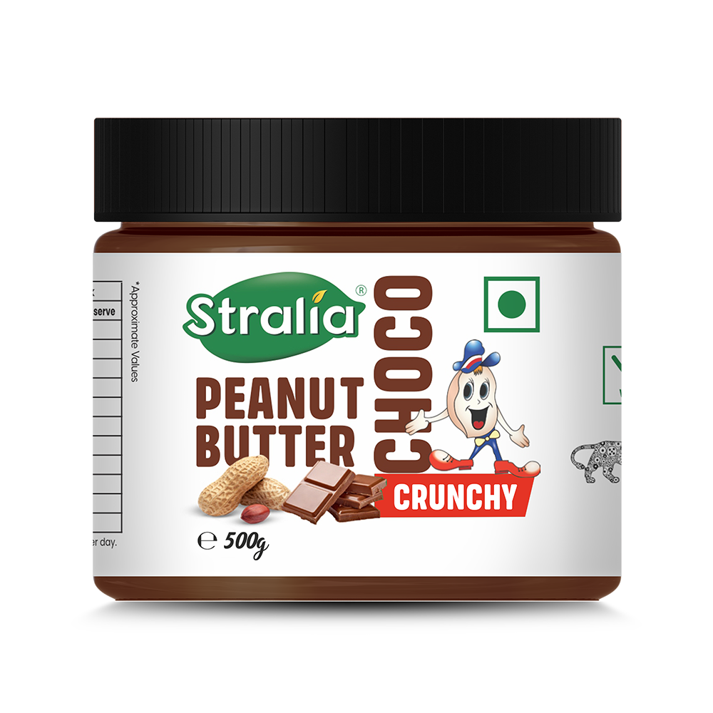 STRALIA Peanut Butter combines creamy peanut butter, made with carefully selected peanuts from Saurashtra, with the rich sweetness of chocolate for a truly satisfying treat. It’s a Healthy and Gluten-Free source of Protein, packed with natural Healthy Fats and Vitamin B3. No Trans Fat, and Cholesterol Free. Perfect for dipping or spreading, this peanut butter is also versatile for baking and snacks. STRALIA Peanut Butter is ideal choice for fitness buffs, gym goers, dieters and health conscious individuals.